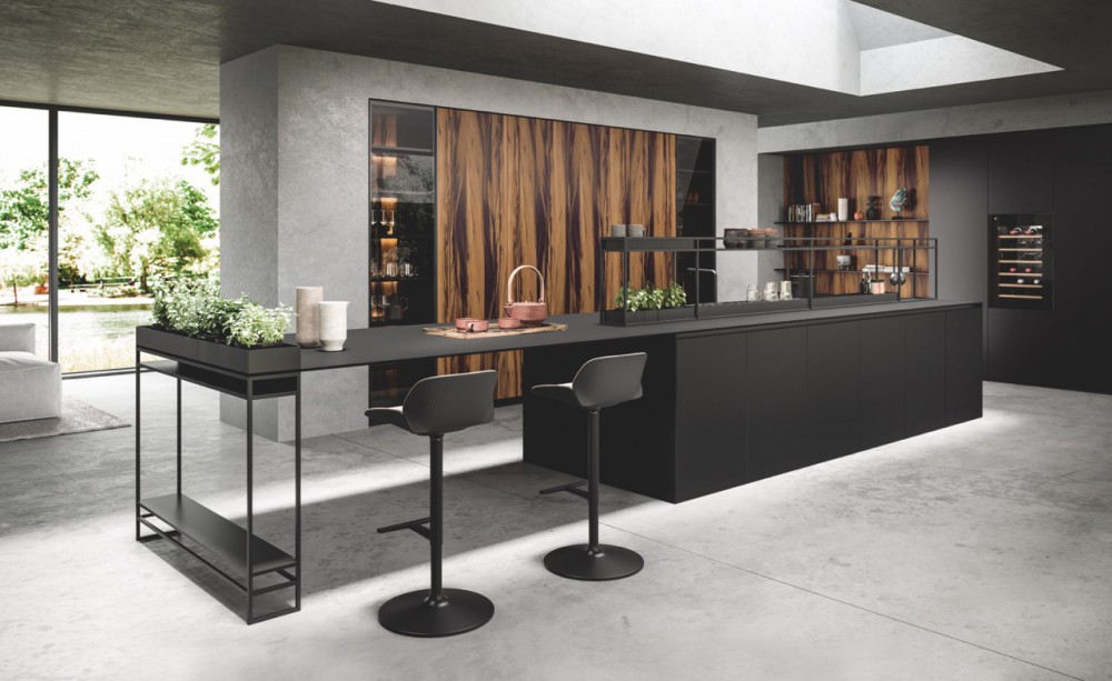 La versatilità degli elementi Tekno in alluminio, su disegno esclusivo, caratterizzano e personalizzano l’isola di Sistema laccata metallo Cast Iron Carbone.