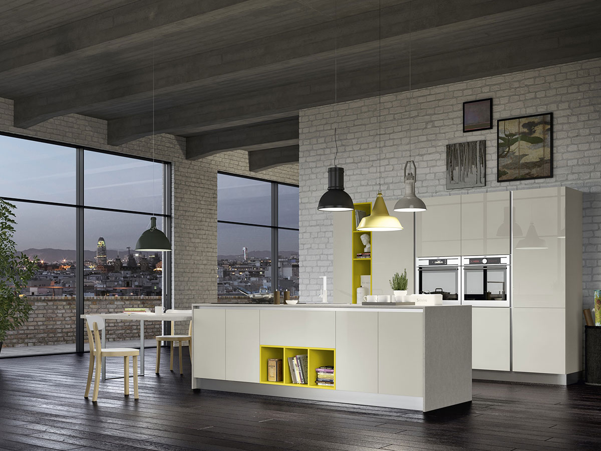 Massima libertà nella scelta delle finiture, grazie all’anta con telaio in alluminio rivestito e all’apertura a gola. I materiali ricercati abbinati a dettagli e accessori in metallo, insieme alla soluzione compositiva con volumi essenziali collocati in uno spazio aperto, creano una cucina protagonista di un’ambiente classico e contemporaneo.
