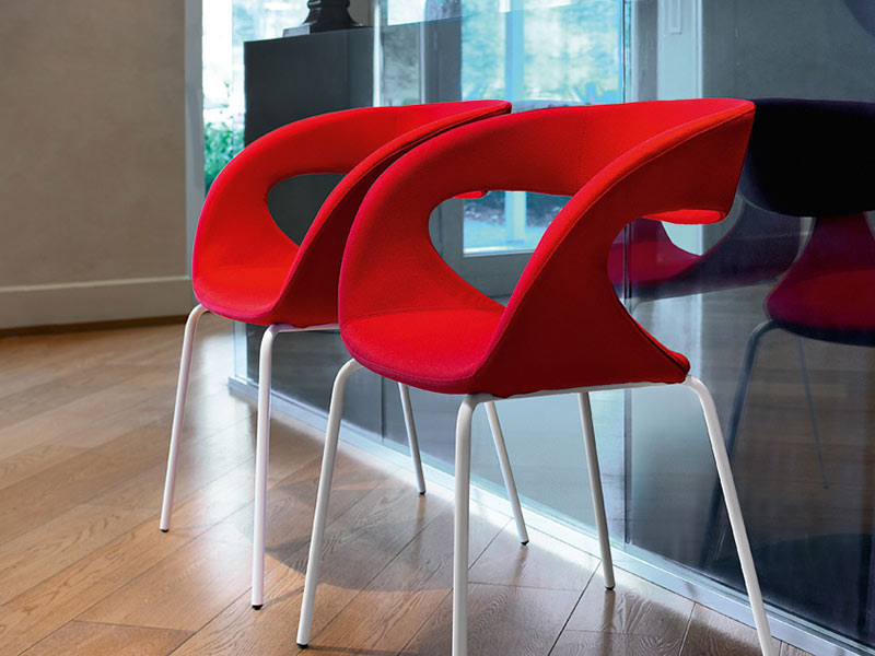Sedia in tubolare metallico a sezione tonda impilabile con scocca curvata in legno multistrato nobilitato melamminico Seduta impilabile dalle curve delicate ed essenziali, con scocca in legno multistrato nobilitato melamminico effetto legno o monocolore, da abbinare ai piani o alle gambe dei tavoli.